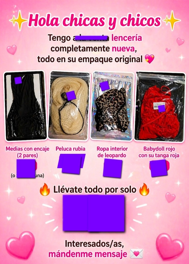 ✨ Hola chicas y chicos ✨ Tengo lenceria completamente nueva, todo en su empaque original 💖 ● Peluca rubia: ● Medias con encaje (2 pares): ● Ropa interior de leopardo: ● Babydoll rojo con su Tanga roja : Interesados/as, mndenme mensaje 📩 Telegram @Natachys2026